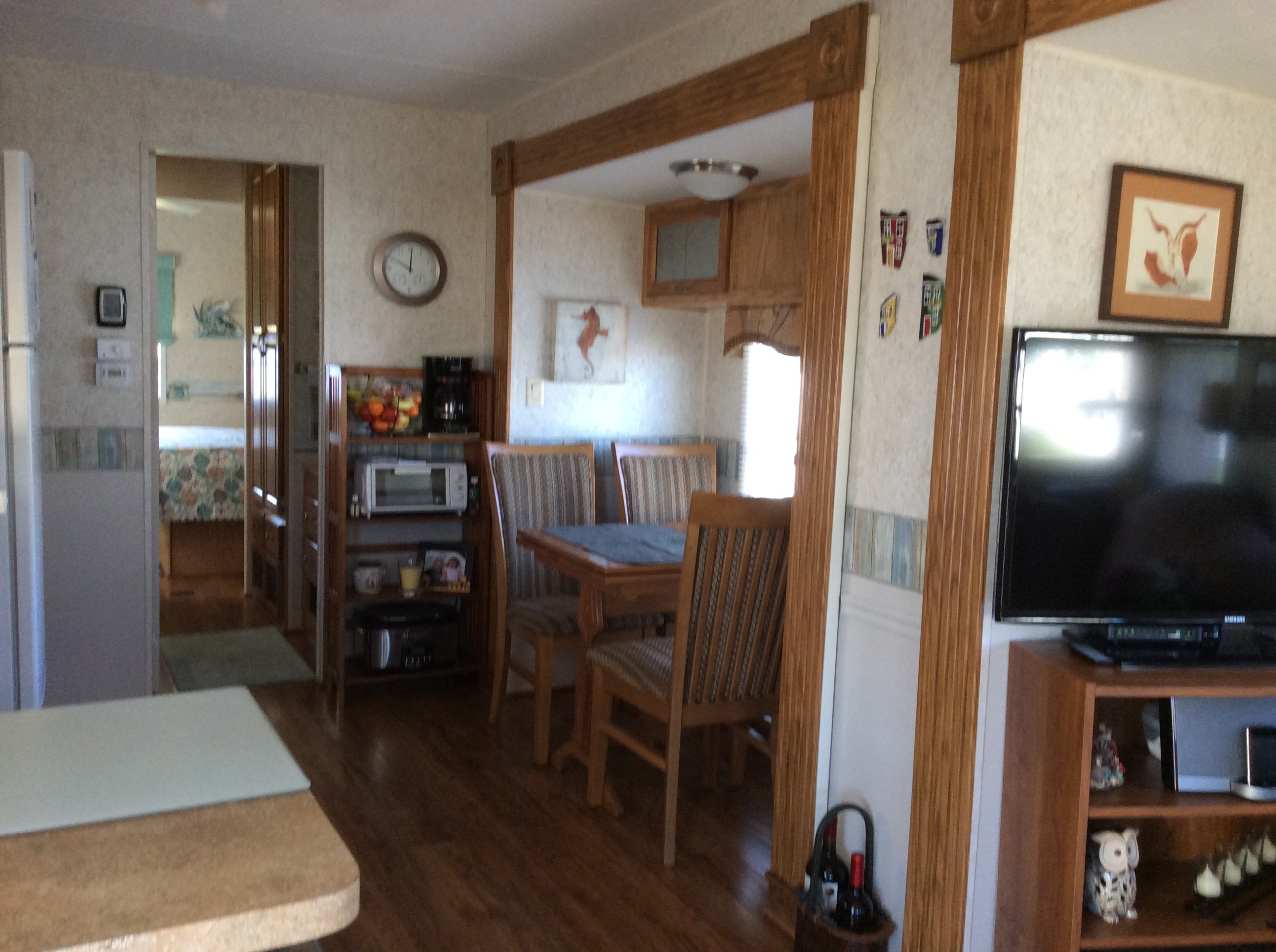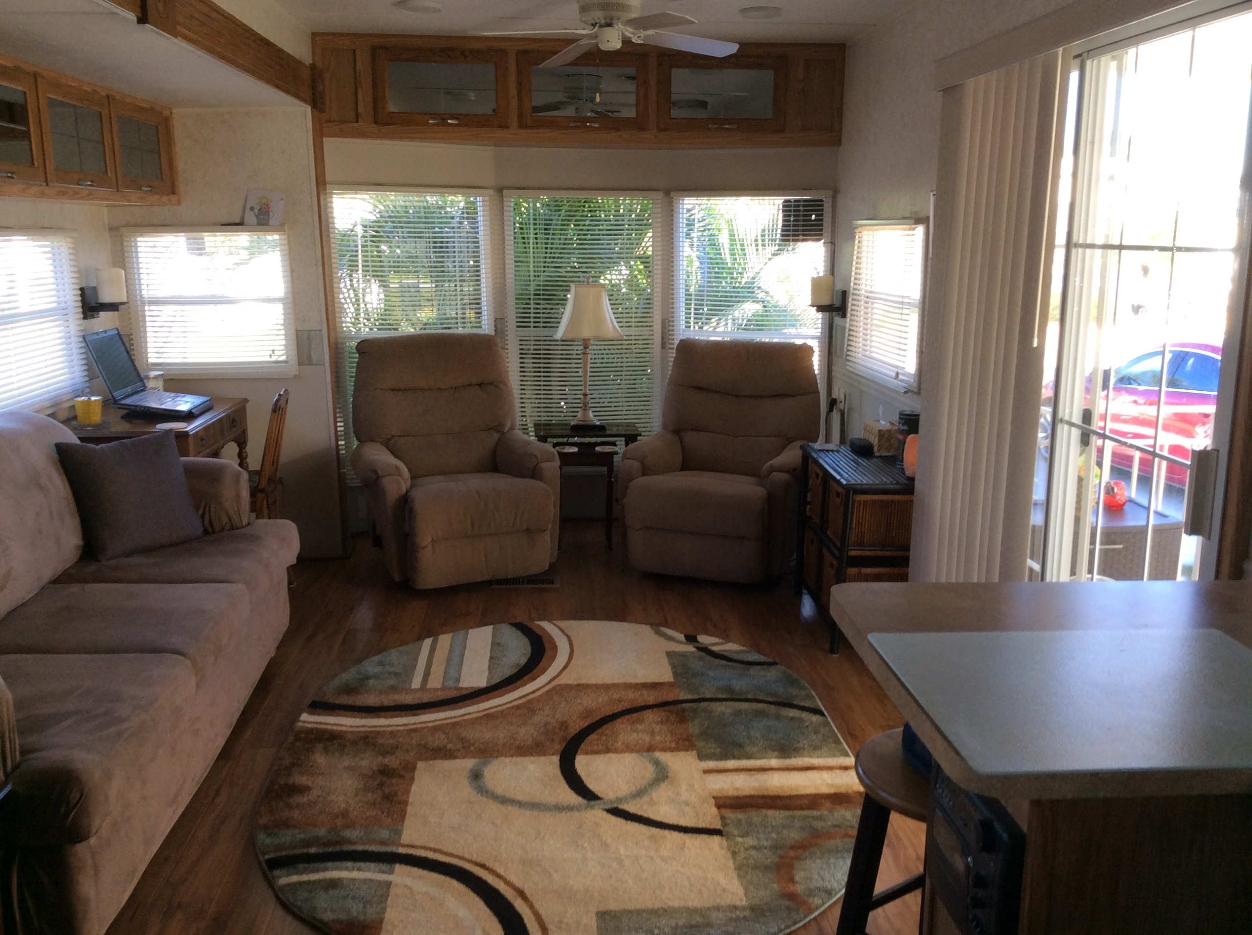 - Fully Furnished with Sleeper Sofa, Free Standing Dinette with 4 chairs, Residential Refrigerator, Free Standing Stove and Oven, and Microwave/Convection Oven